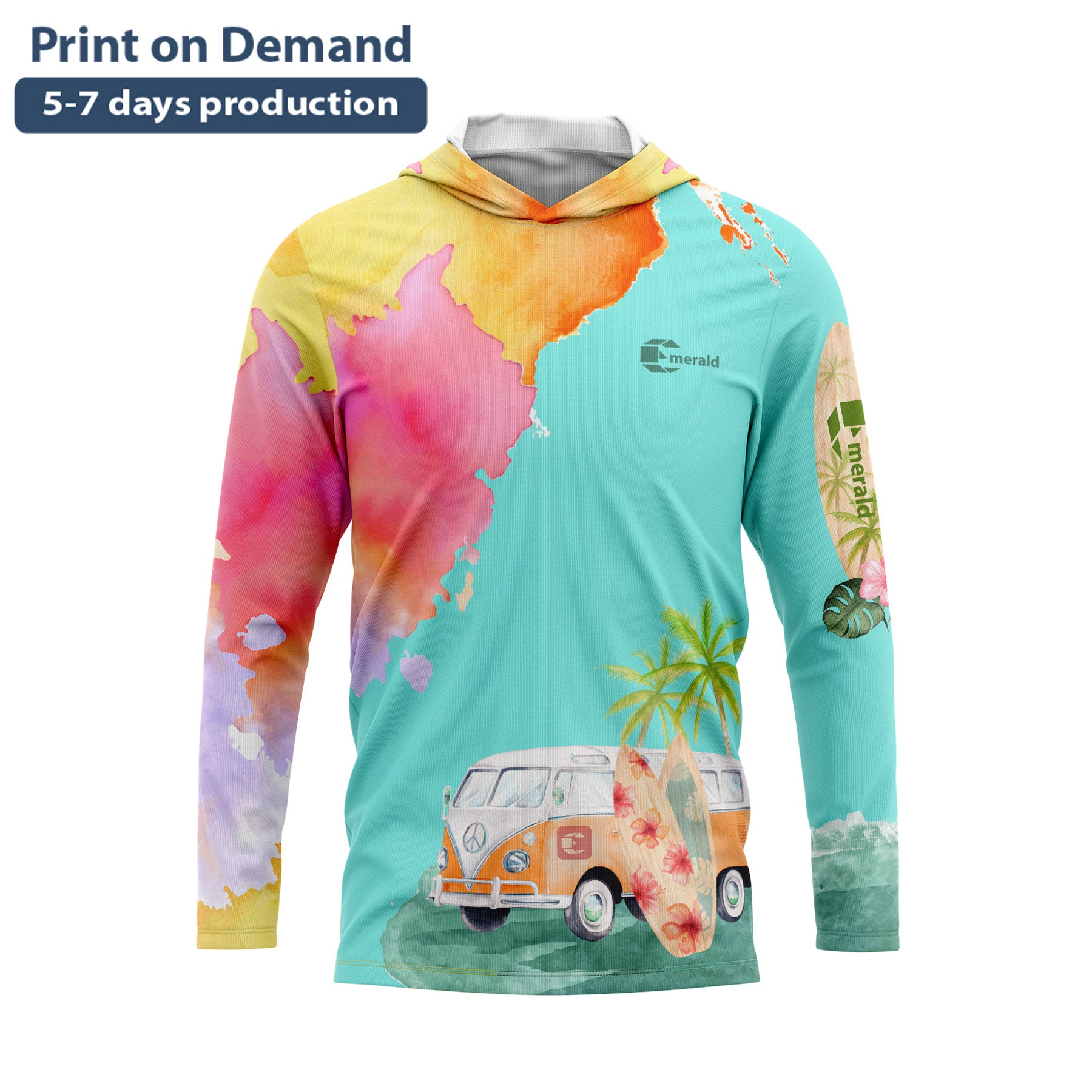 Emerald Surfing Sport! With a unique tropical Color and VW design Long Sleeve Hoodie. Artwork by: Starlight Designs.